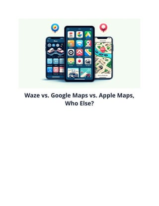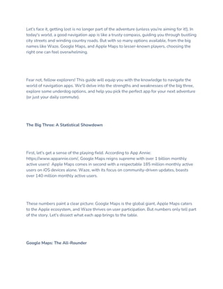 This document provides a comprehensive comparison of popular navigation apps: Google Maps, Apple Maps, and Waze, highlighting their strengths and weaknesses. Google Maps is noted for its extensive database and real-time traffic updates, while Apple Maps offers a user-friendly interface and privacy features. Waze stands out with its community-driven updates, but the document also suggests exploring alternatives like Here WeGo for offline navigation and CoPilot GPS for professional drivers.