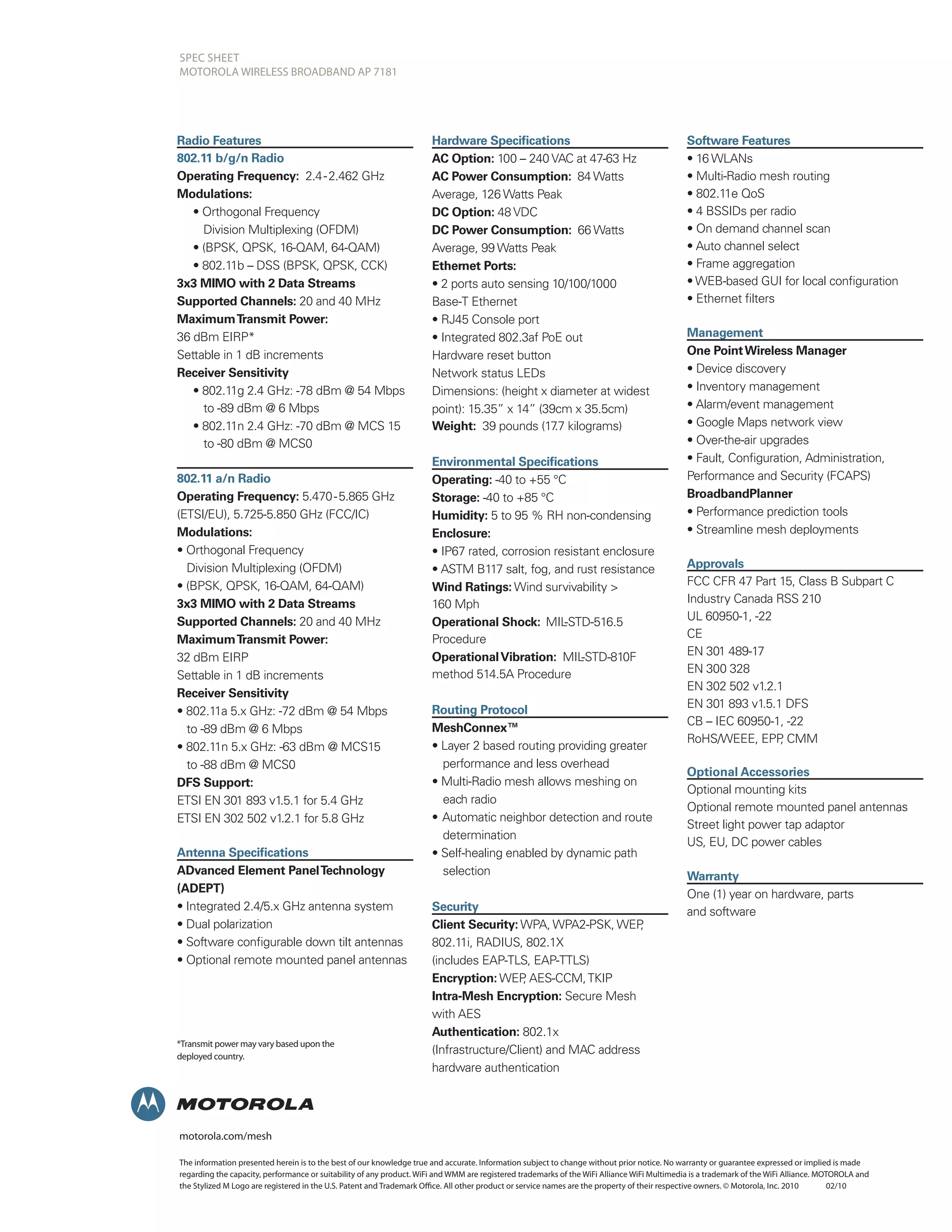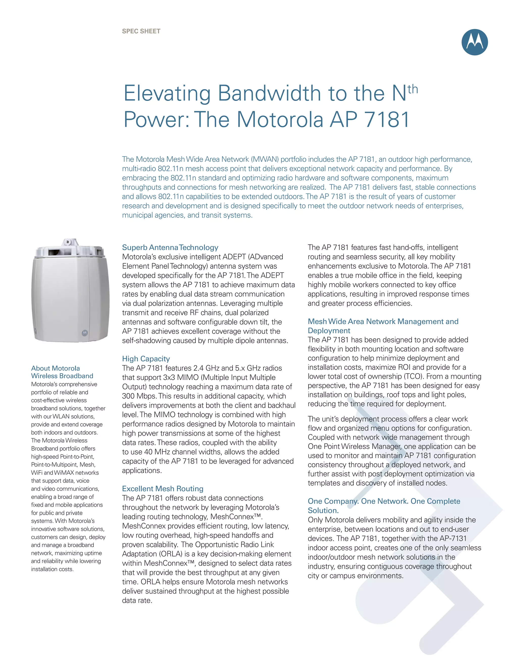 The Motorola AP 7181 is an outdoor, dual-band 802.11n mesh access point that delivers high network capacity and performance using 3x3 MIMO technology. It features dual polarized antennas that achieve excellent coverage without self-shadowing. The AP 7181 supports data rates up to 300 Mbps and uses Motorola's robust MeshConnex routing technology for efficient mesh networking. It is designed for flexible mounting and easy deployment in enterprise and municipal wireless networks.