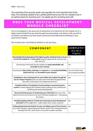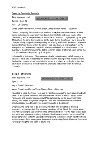 The document summarizes the songwriting and production process for two songs created by the author for a music course assignment. For the first song, "Sympathy Empathy," the author explored the alternative rock/indie genre, drawing inspiration from bands like Title Fight and Sonic Youth. Throughout the songwriting and production process, the author focused on maintaining a slow tempo to illustrate the somber mood of the lyrics. For the second song, "Streamline," the author took inspiration from folk and singer-songwriter styles, originally intending the song to have a country indie folk and lo-fi sound inspired by Pink Floyd. However, the final track differed significantly from the author's initial expectations and incorporated elements like piano and effects