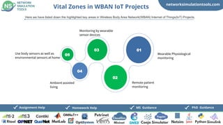 The document outlines essential aspects of Wireless Body Area Network (WBAN) Internet of Things (IoT) projects, including key areas such as wearable physiological monitoring and remote patient monitoring. It also identifies various security issues and technical hurdles faced in these projects, including biometric authentication and data management challenges. The source provides guidance and support for PhD and MS assignments related to these topics.