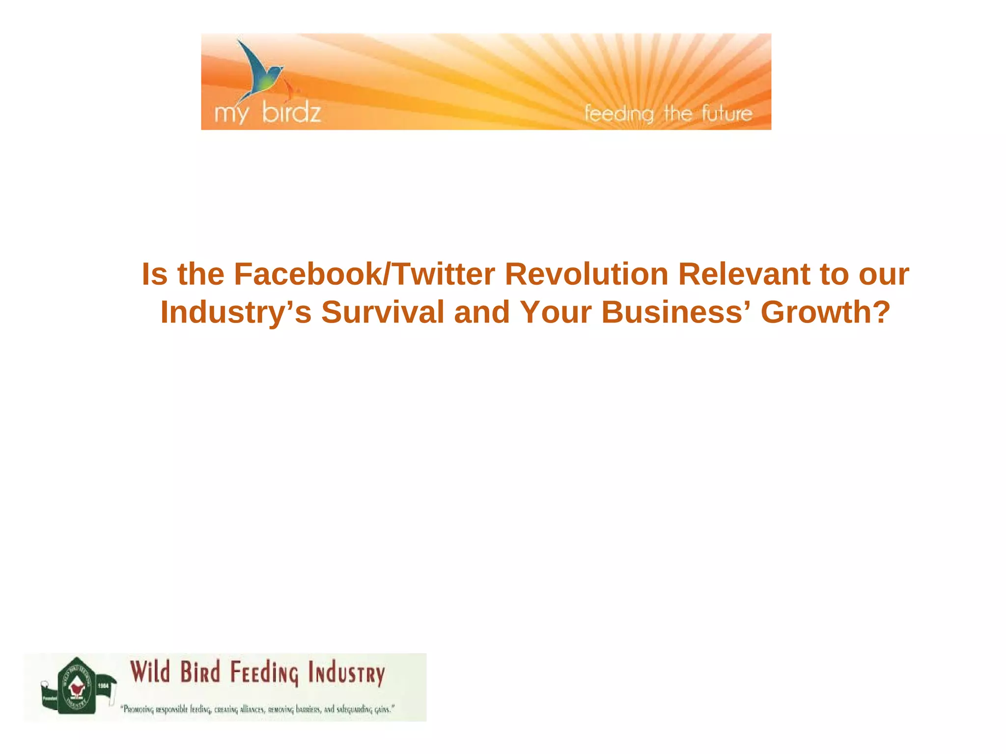 The document discusses how social media like Facebook and Twitter have revolutionized digital communication and how businesses must adapt to survive. It notes statistics on growth of social platforms and demographics of social media users. The presentation argues the wild bird feeding industry needs a fresh digital strategy combining traditional advertising with social media to engage customers and grow. Challenges to implementing social media are addressed. The speaker advocates listening to customers online and setting goals to leverage social platforms for marketing and collaboration across the industry.