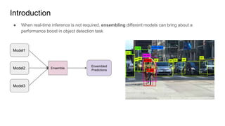 Weighted boxes fusion (WBF) is an object detection ensemble method that averages bounding box predictions from multiple models rather than discarding redundant boxes. It works by clustering overlapping boxes, calculating a weighted average bounding box for each cluster, and rescaling confidence scores based on cluster size. This allows all predictions to contribute to the final output. WBF is shown to outperform non-maximum suppression (NMS) and soft-NMS on ensembles of different object detection models and with test time augmentation, producing more accurate averaged predictions.