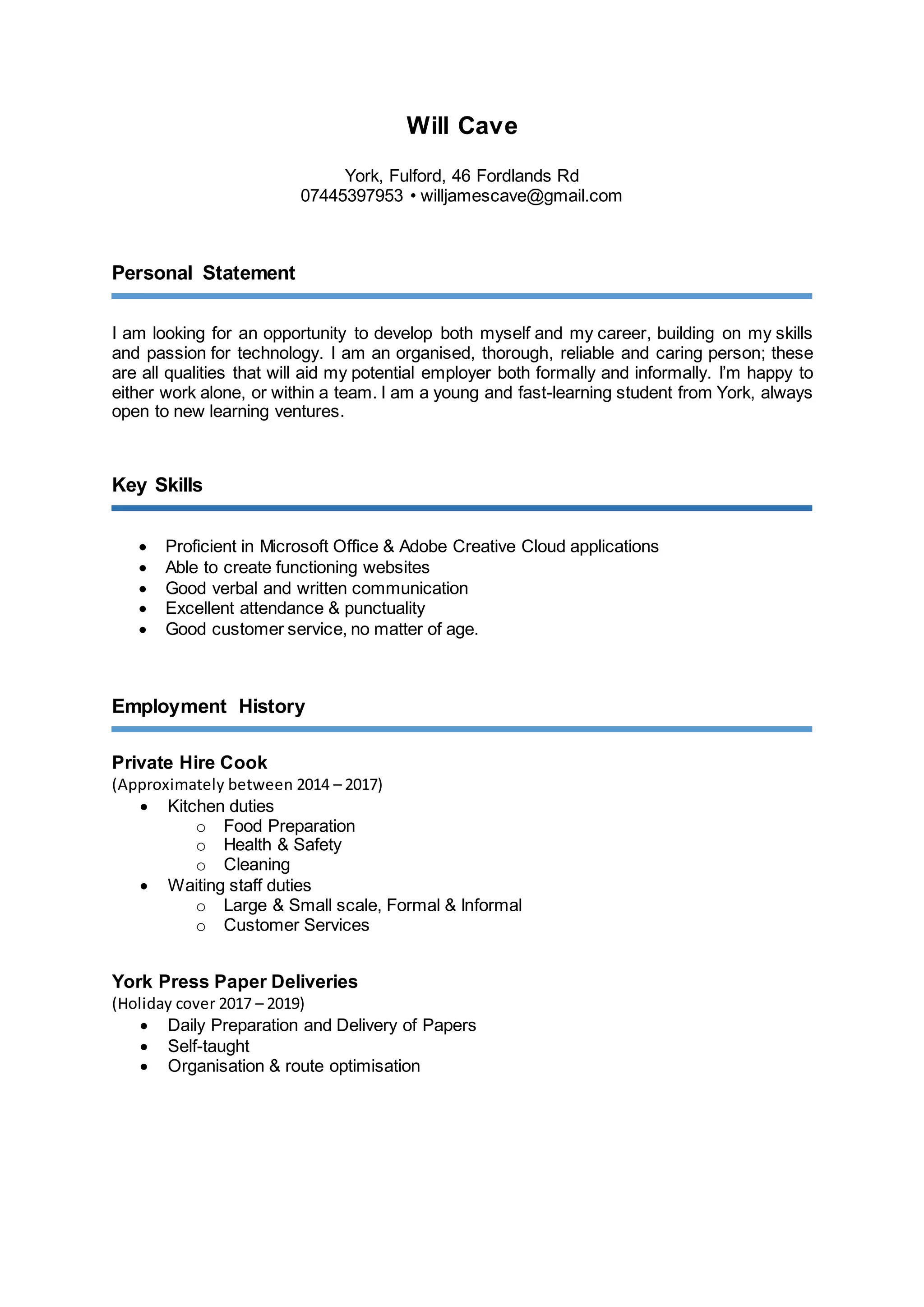 Will Cave is seeking an opportunity to develop his career and skills in technology. He has strong organizational skills and can work independently or as part of a team. His past work includes private hire cooking, delivering newspapers, and studying creative media and production technologies in college. He has proficiency in Microsoft Office, Adobe Creative Cloud, and website design. In his personal time, Will enjoys video games, game and media design, keeping up with current events, history, and discovering new music.