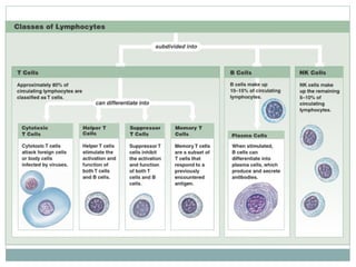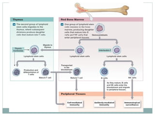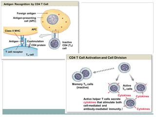 This document summarizes the key components of cellular immunity, including adaptive and innate immunity. It describes the properties of immunity, such as specificity and memory. The major topics covered are cytokines, MHC proteins, lymphocytes, antigen presentation, T cell activation, and B cell activation. Adaptive immunity involves cell-mediated responses by T cells and antibody-mediated responses by B cells. Innate immunity provides genetically determined defenses.