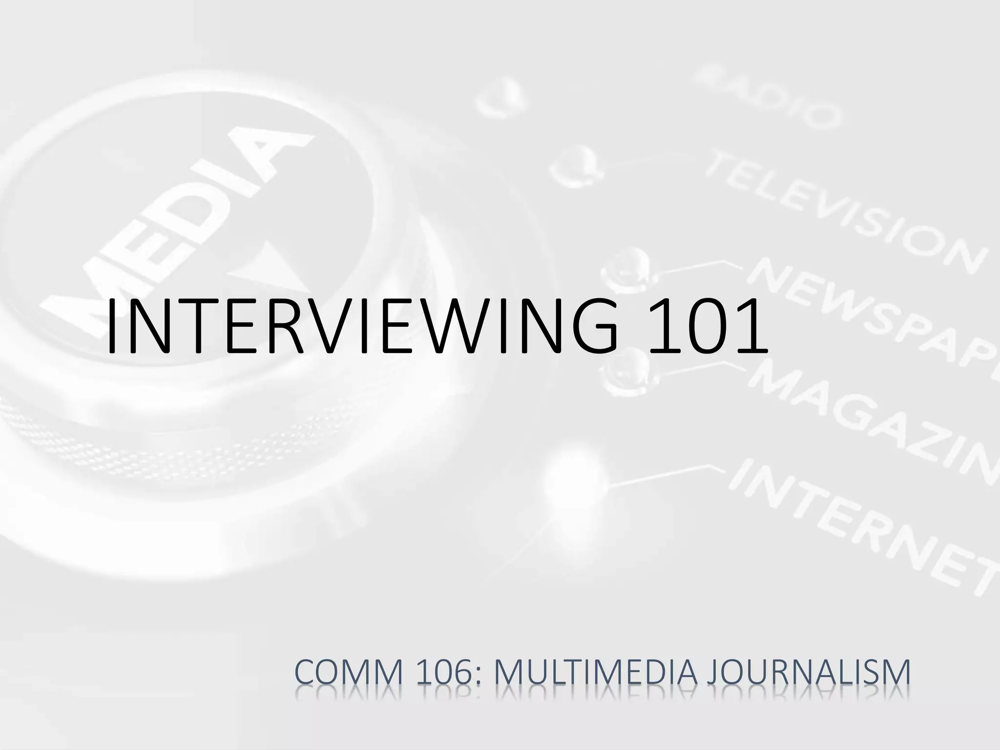 This document provides guidance on conducting effective interviews. It discusses that interviews come in different forms but there are basic guidelines. It advises using language that puts interview subjects at ease rather than using stressful terms like "interview". When initially contacting subjects, reporters should limit information to their name, affiliation, and purpose for the discussion. Questions should be open-ended to elicit detailed responses rather than yes/no answers. Reporters must do research beforehand to ask informed follow-up questions and avoid biases. The goal is a natural conversation where the reporter guides the discussion to obtain relevant information.