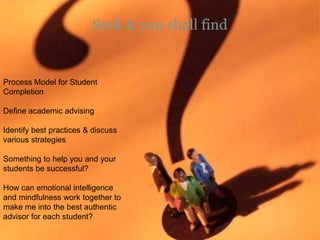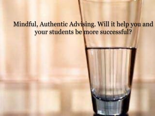 This document discusses mindful, authentic academic advising and how it can help students succeed. It defines academic advising as a series of intentional interactions meant to contextualize students' educational experiences within their goals, abilities, and lives. The document discusses best practices for advising, including developing emotional intelligence and mindfulness. It suggests that when advisors skillfully apply mindfulness to enhance their emotional intelligence, they can become effective authentic advisors who help students develop these skills as well.