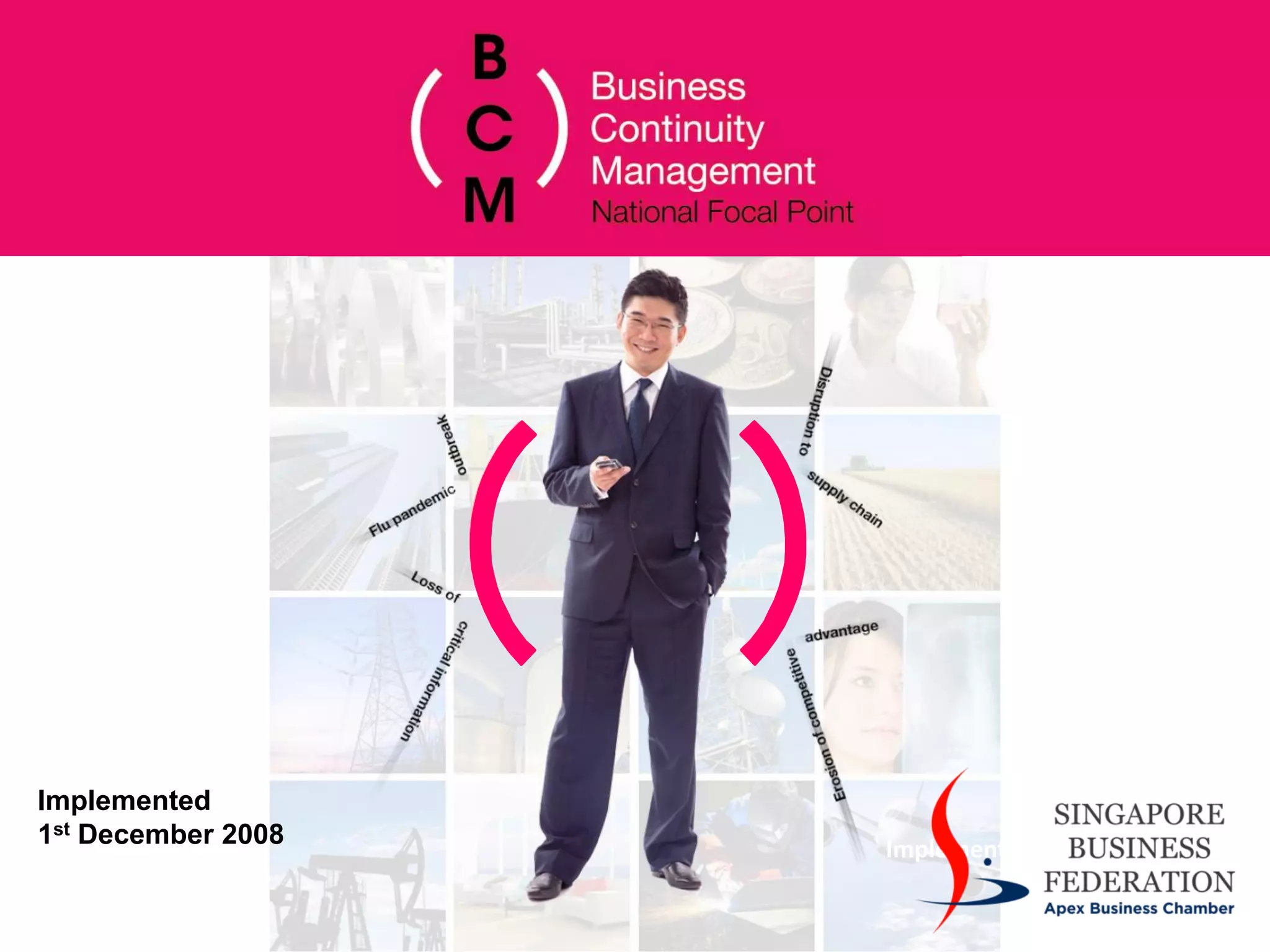 The document discusses Business Continuity Management (BCM), including what BCM is, how it applies to organizations, its benefits, and information about the National BCM Programme which provides funding support of up to 70% for organizations to obtain BCM certification. The funding support covers costs associated with BCM certification like staff salaries, third party consultancy fees, and IT hardware/software needed for implementation. Eligible organizations include SMEs and larger companies forming consortiums with at least 50% SME participation.