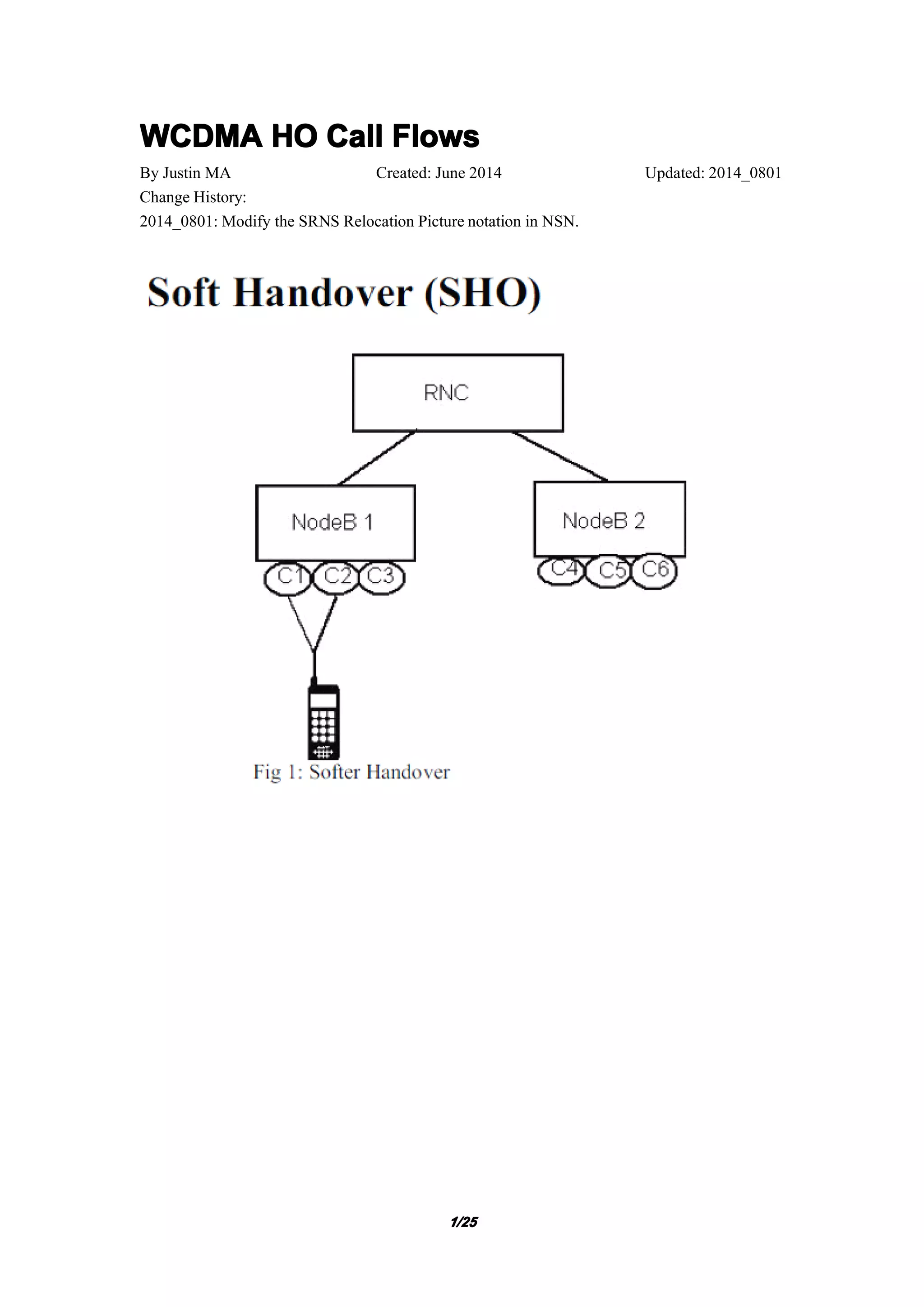 The document outlines various procedures and reference implementations for handovers in WCDMA networks, including soft and hard handovers within and between RNCs, as well as service-based intersystem handovers from UTRAN to GSM. It lists multiple references for protocols and technical specifications related to radio link management and synchronization. The information is structured in a list format covering different handover scenarios and related actions.