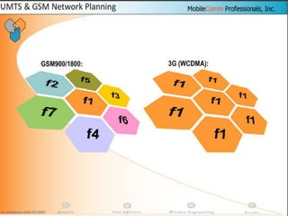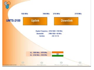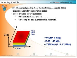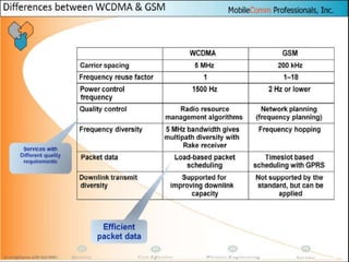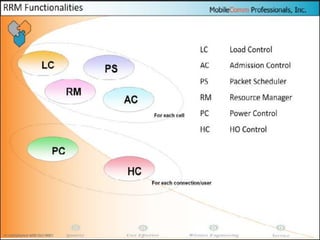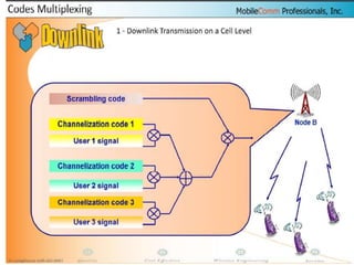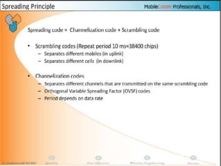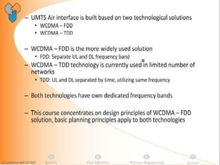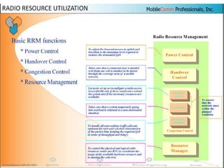 The document discusses different methods for establishing channels in radio technologies: FDMA uses different frequencies for each user; TDMA uses different time slots on the same frequency; W-CDMA uses unique code patterns to distinguish each user on the same frequency. It also describes the UMTS frame format and power control mechanisms in UMTS, including inner loop power control which adjusts transmission power based on comparisons to Eb/Nt objectives, and outer loop power control which estimates Eb/Nt objectives based on measured frame error rates.
