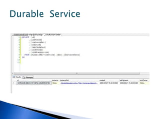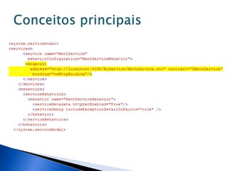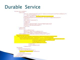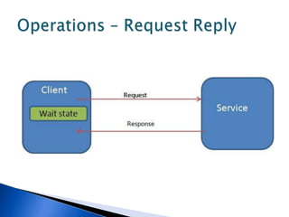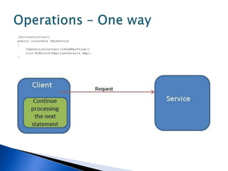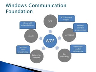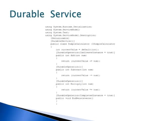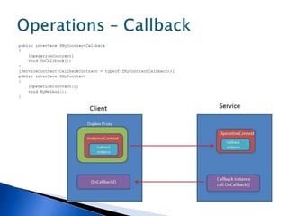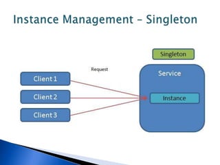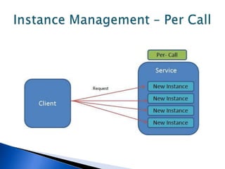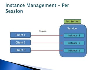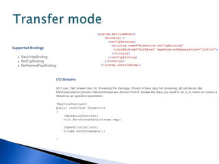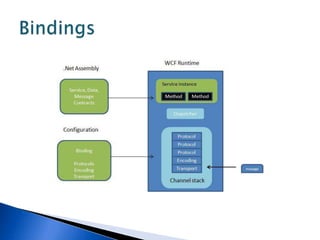 This document discusses various WCF bindings and their descriptions. It covers bindings like BasicHttpBinding, WSHttpBinding, WSDualHttpBinding, WSFederationHttpBinding, MsmqIntegrationBinding, NetMsmqBinding, NetNamedPipeBinding, and NetTcpBinding. It describes features like security, reliability, transactions and protocols supported by each binding. It also discusses instance management and hosting options in IIS, self-hosting, Windows Service etc.