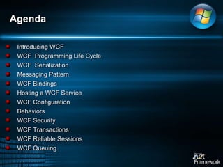 WCF provides a unified programming model for building service-oriented applications. It enables developers to build secure, reliable, and transacted solutions that integrate across platforms and interoperate with existing investments. WCF implements SOAP-based web services as its fundamental communication mechanism and supports WS-* standards for security, reliability, transactions, and metadata exchange. Developers can define services using contracts, expose endpoints using addresses and bindings, and apply behaviors to customize runtime properties.