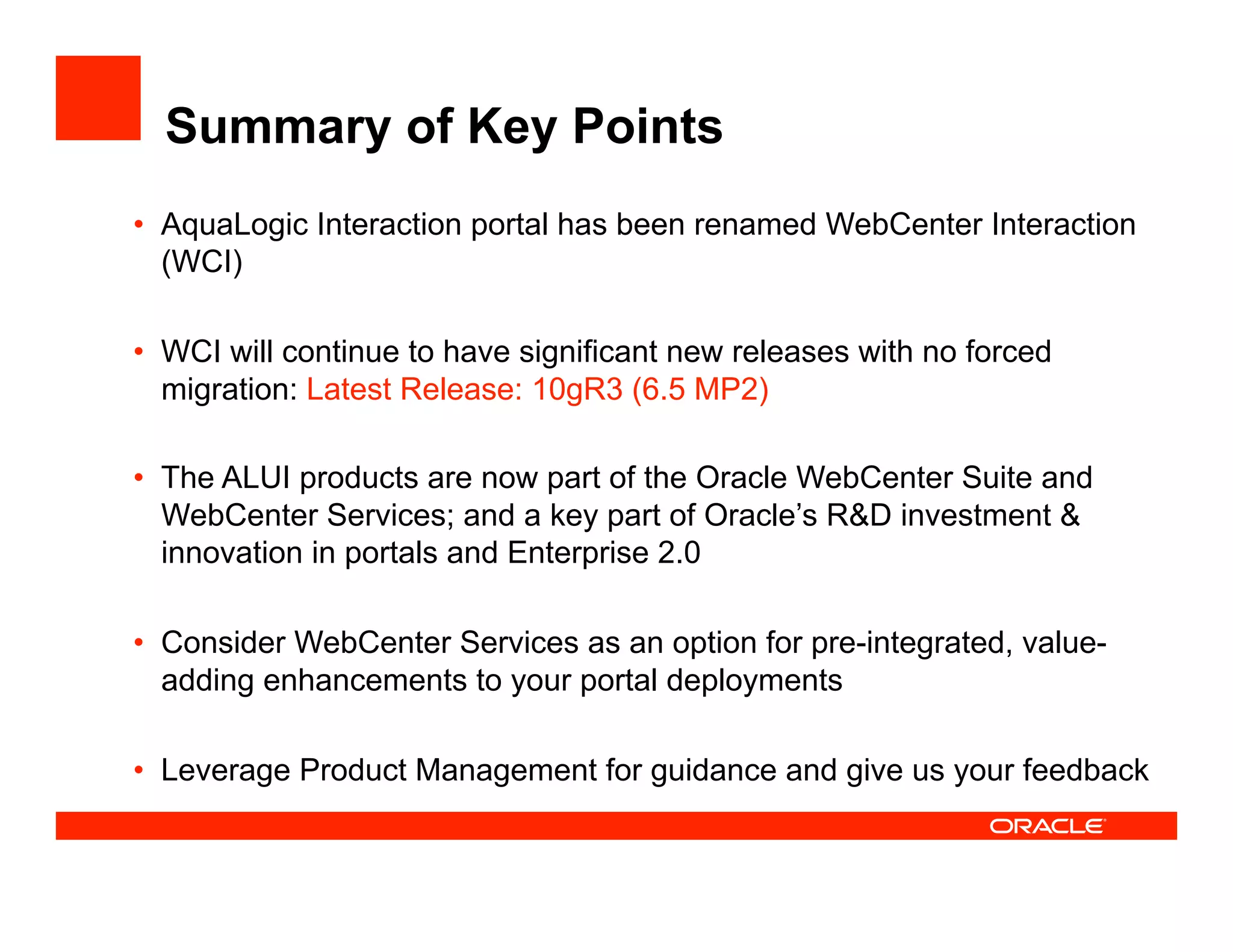 The document discusses Oracle's WebCenter Interaction 10gR3 product. Some key points include: WebCenter Interaction was previously known as AquaLogic Interaction Portal; it is now part of Oracle's WebCenter Suite and will continue to receive major and minor releases; and the latest release, 10gR3, features improvements to the user interface, social capabilities, and integration with other Oracle products.
