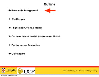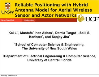 The document discusses a hybrid antenna model for reliable positioning in aerial wireless sensor and actor networks (AWSANs) and presents applications such as fire detection and atmospheric sensing. It addresses challenges in communications and positioning strategies, highlighting the use of valence shell electron pair repulsion (VSEPR) theory and an o-BESPAR antenna model that combines omnidirectional and directional properties for improved connectivity. Performance evaluations based on packet reception rates and reorganization delays demonstrate the effectiveness of the proposed strategies in real-world scenarios.