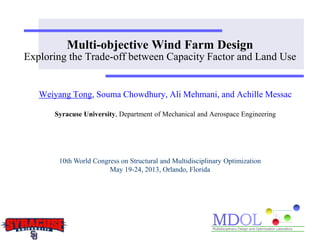 This document presents a bi-level framework for visualizing trade-offs in wind farm design between capacity factor and land use. The lower level uses multi-objective optimization to explore the trade-off for different nameplate capacities. The upper level fits curves to pareto solutions to parametrically represent the trade-off as a function of nameplate capacity. A numerical experiment applies the framework to a case study exploring capacity factor and land area per MW installed. The framework aims to streamline wind farm planning by quantifying key design trade-offs.