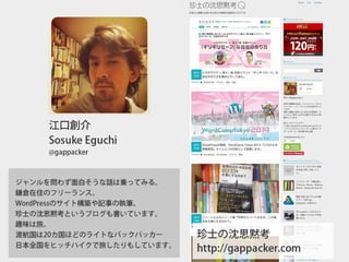 WordCamp Tokyo 2014で行われたパネルディスカッション『これからの情報発信』登壇者の紹介と当日のお題のスライドです。
