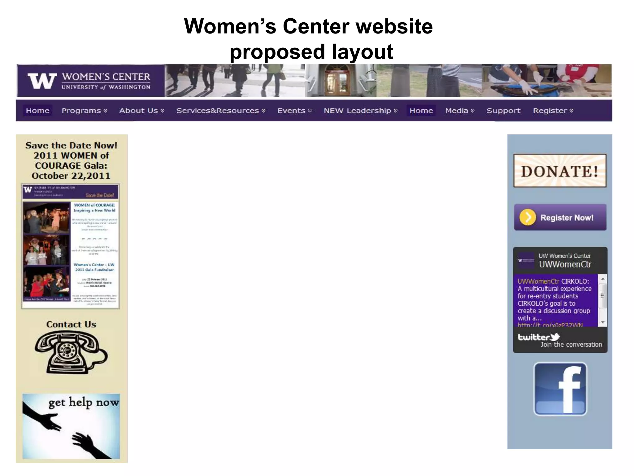 The document proposes layouts and menus for the Women's Center website. It includes sidebars for resources, social media, and highlights. The resource sidebar would link to the resources directory, lactation stations, and UW and community resources. The social sidebar would include RSS feeds. Program sections would include overviews, objectives, visions, courses, instructors, testimonials and registration. Menus are proposed for various programs like Lifelong Learning, Making Connections, Re-Entry, Gender Equity and Violence Prevention, New Leadership Puget Sound, and Human Trafficking Research and Policy Development.