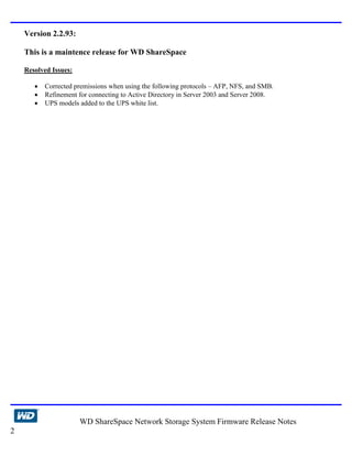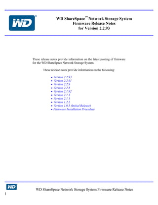 This document provides release notes for nine versions of firmware for the WD ShareSpace Network Storage System, from the initial version 1.0.5 to version 2.2.93. Each version listing includes any resolved issues from the previous version. Instructions are provided on how to check for and install firmware updates through the device's web interface.