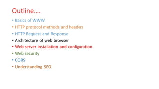 Basics of WWW, HTTP protocol methods and headers, HTTP Request and Response, Architecture of web browser, Web server installation and configuration, Web security, CORS, Understanding SEO