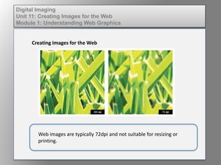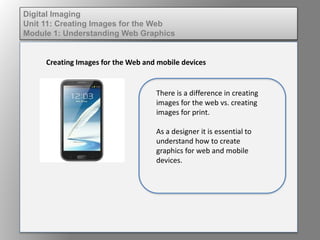 There are key differences in creating images for the web versus print. Images for the web are typically lower resolution at 72dpi, compressed for faster loading, and not suitable for resizing or printing. It is important for designers to understand how to optimize graphics for web and mobile devices by using the proper resolution, compression, and rendering custom fonts as images to ensure consistency across browsers.
