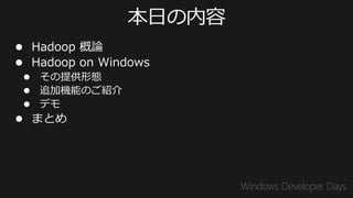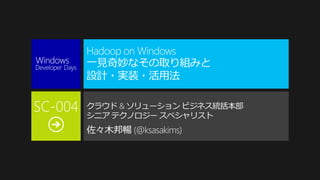 Windows Developer Daysで使ったHadoop on Windows (Server|Azure)紹介資料です。「設計・実装・活用法」というタイトルとは裏腹にただの概要紹介になってしまったので、もう少しましなものを作りたいと思っています・・・