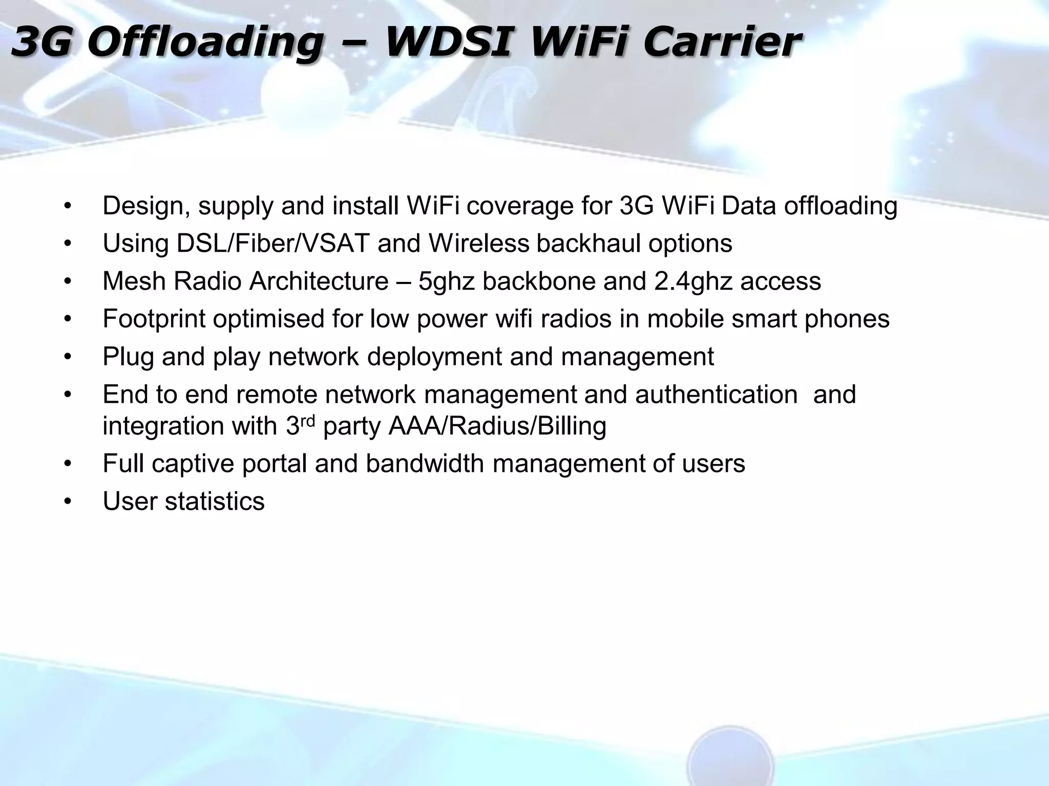 The document discusses WDSI's WiFi carrier offloading and dashboard solution. It provides an overview of the mesh radio architecture and features like remote management, authentication integration, bandwidth management and user statistics. The dashboard allows monitoring of network health and performance through features like node tracking, usage reports, drill down to individual nodes, and customizable reports. It supports thousands of concurrent users across a wide coverage area through its mesh network design.
