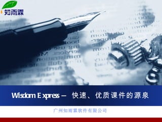 文档介绍了广州知雨霖软件有限公司的课件制作工具 wisdom express,强调了其在电子学习中的重要性和快速开发能力。该工具的设计关注用户需求,提供简单的制作流程和丰富的教学设计方案,以满足企业的个性化需求和内容更新。文档还讨论了传统课件制作工具的不足之处,以及如何通过新工具提升课件质量和制作效率。