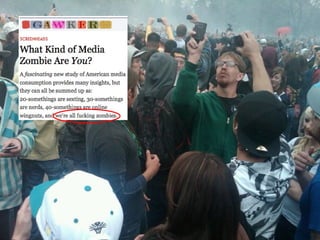 The document explores the concept of living in a media-saturated environment, likening individuals to 'media zombies' who process information rather than engage productively. It suggests that when everyone is transparent in their lives, societal values shift away from superficial concerns to addressing real issues. The text raises questions about the implications of this shift on individual ideology and the collective focus on societal problems.