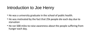 Joe Henry was motivated to raise awareness about the 25,000 people who die daily from starvation. He ran 500 miles to inspire donations to fight world hunger, with a goal of raising $100,000 which could feed 25,000 school children one meal. To prepare, Joe changed his vegetarian diet and underwent rigorous training, including running 30 miles per day and winter training in cold mountains. Though some saw his efforts as "crazy", Joe used his endurance to inspire donations and highlight global hunger, believing his actions could have a lasting, long-term effect.