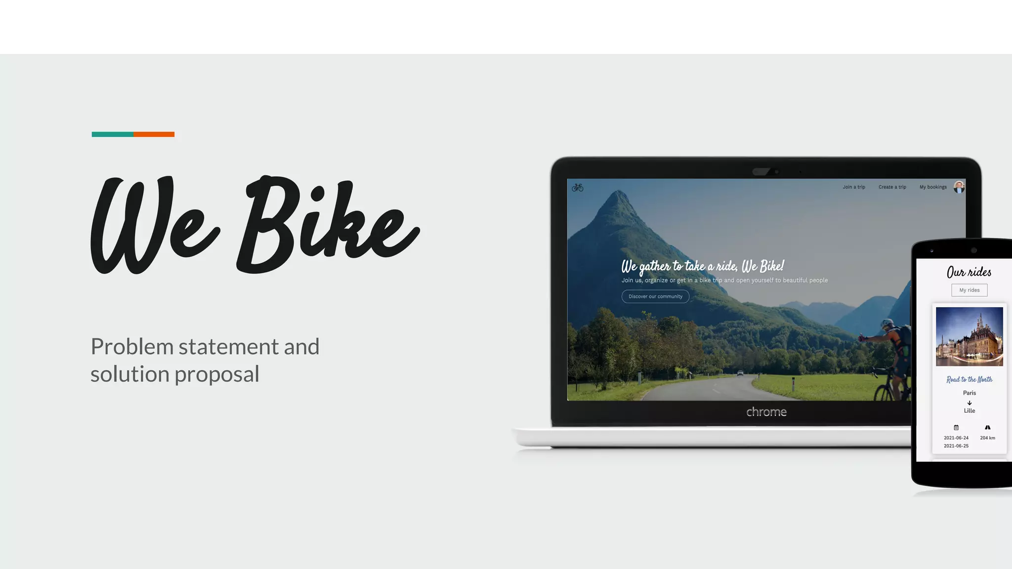 This document outlines a problem statement and solution proposal for a "We Bike" project. It begins by explaining the problem, how customers currently deal with the problem, and supporting research. It then proposes a solution and compares it to existing solutions. Wireframes of the proposed user interfaces are presented, along with design decisions. Next steps discussed are gathering feedback on the wireframes, user testing plans, and timelines.