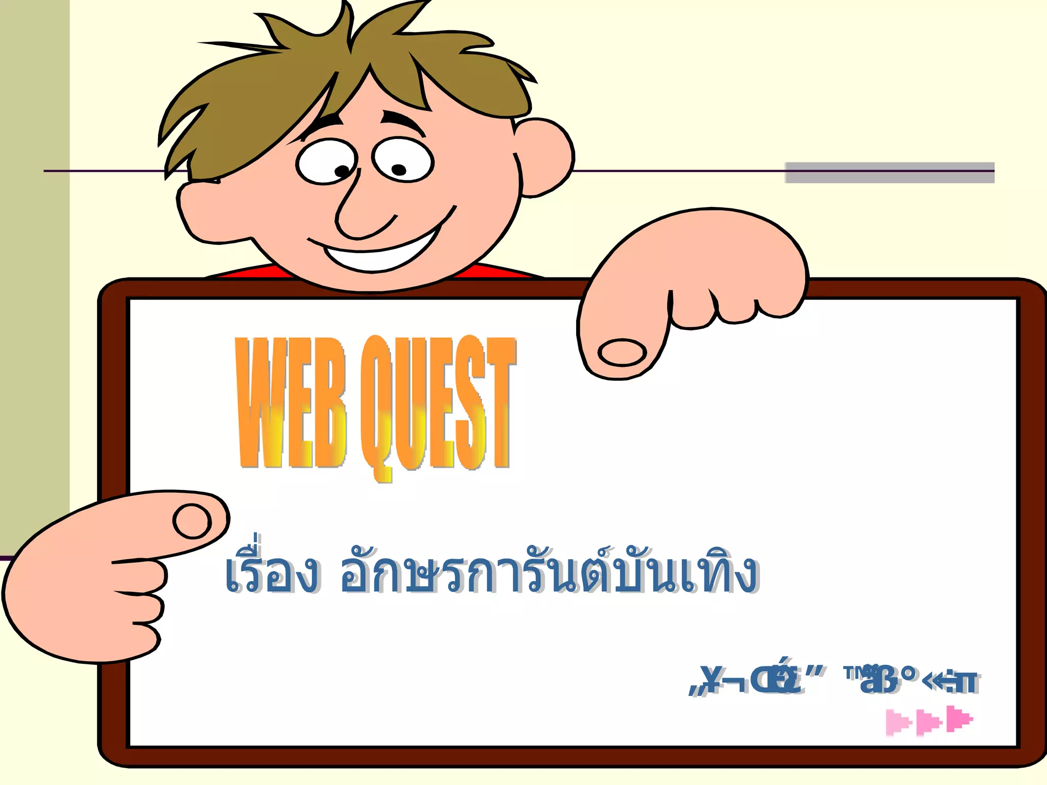 WEB QUEST :อักษรการันต์บันเทิง อ้างอิง - แนวการเรียนรู้วิชาภาษาไทย ชั้น ป . 5 - [email_address] - ขอขอบคุณอาจารย์ธวัช วันชูชาติที่เอื้ออำนวยเรื่องหนังสือ ประกอบการเขียน web quest เรื่องอักษรการันต์ บทนำ งาน แหล่งข้อมูล กระบวนการ การประเมิน บทสรุป อ้างอิง ติดต่อผู้จัดทำ - 11.