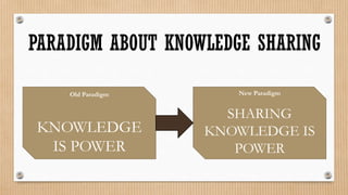 This document discusses the importance of knowledge sharing and moving from an old paradigm where knowledge is power to a new one where sharing knowledge is power. It outlines the benefits of knowledge sharing such as innovation, reduced costs, and enhanced employee retention. Barriers to effective knowledge sharing include psychological fears about technology and a lack of tools and training. The document advocates for creating a knowledge sharing culture through leadership example and implementing knowledge sharing technology along with education.