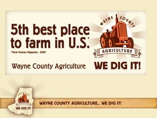 This document discusses trends in agriculture in Wayne County, North Carolina. It notes that the percentage of Americans living on farms has declined drastically from 1790 to present day, while agricultural productivity has increased enormously over the same period. It provides statistics showing that farming and agribusiness make up a significant portion of Wayne County's economy and employment. The number of farms in Wayne County has declined significantly from 1950 to 2007, while farm acreage and gross farm income have also decreased, reflecting trends toward larger, more efficient farm operations.