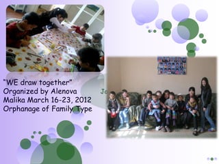 The document summarizes a Global Youth Service Day event organized by Alenova from March 16-23, 2012 at an orphanage in their town. Alenova taught children at the orphanage how to draw still lives and organized an art exhibition of their work. They also collected donated clothes and toys from classmates to provide support to the orphanage, which was not receiving enough support from the government. The goal of the event was to teach art skills to the children and support each other through creative activities.