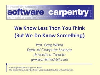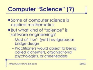 The document discusses the state of software engineering, highlighting the need for empirical evidence-based practices and addressing common misconceptions. It emphasizes issues like poor estimation, unstable requirements, and the high costs associated with software maintenance. Additionally, it critiques the effectiveness of certain development techniques and tools while underscoring the importance of improving skills over reliance on technology.