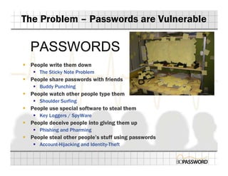 Keystroke dynamics is a behavioral biometric technology that authenticates users based on their unique typing rhythm. It provides a solution to common password vulnerabilities like passwords being shared or stolen. The technology originated from analyzing the unique rhythms of Morse code operators during World War II. It is a software-only solution that does not require special devices and can integrate easily with existing systems. A company called BIOPASSWORD provides keystroke dynamics products and solutions to help organizations secure access and comply with privacy regulations.