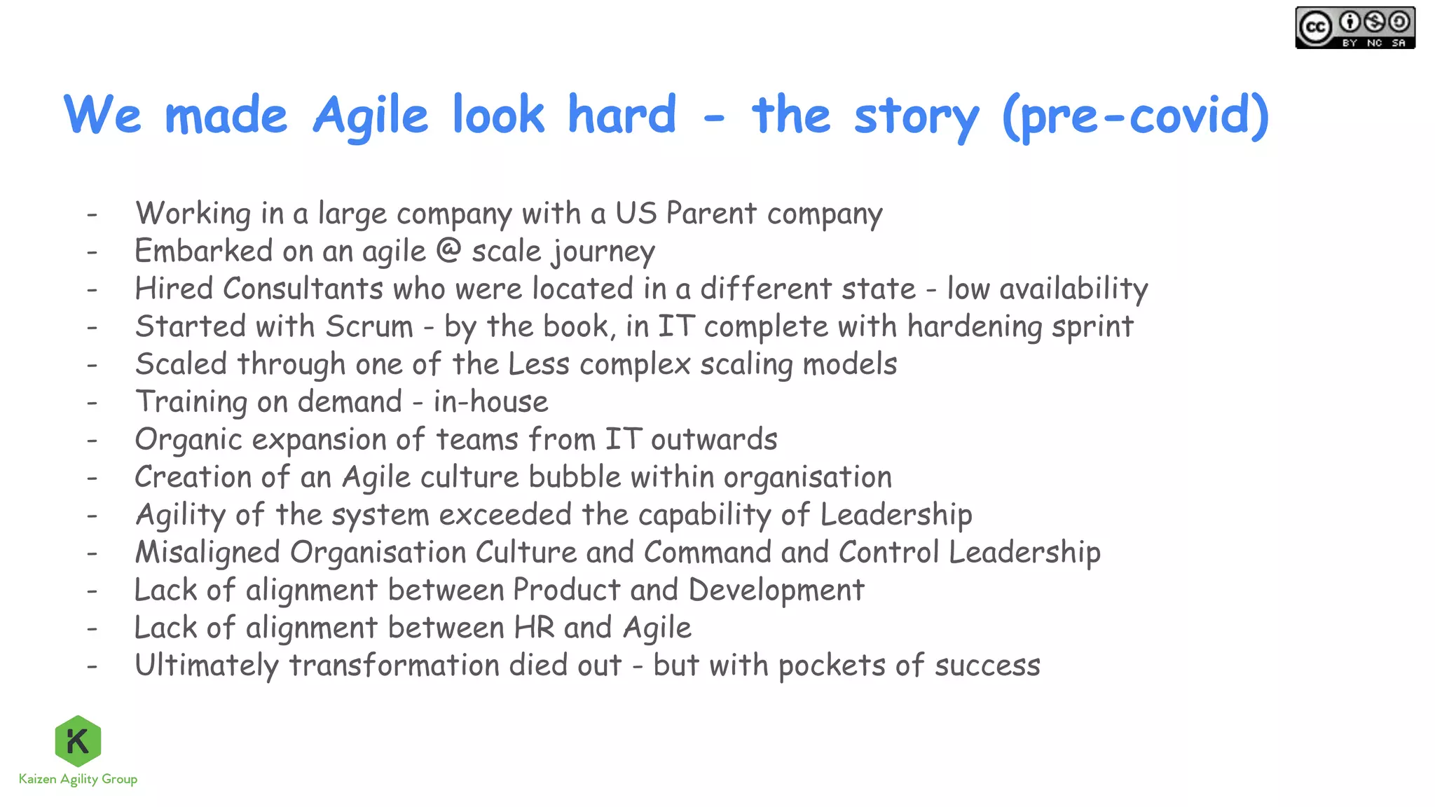 The document discusses the challenges faced during an agile transformation within a large company, highlighting issues such as misalignment in culture and leadership, lack of training, and inconsistent processes. It emphasizes the importance of focusing on purpose, leadership alignment, and co-creating a desired culture rather than strictly following agile methodologies. Ultimately, it suggests practical steps to simplify the agile process, encouraging flexibility, experimentation, and a people-centric approach.