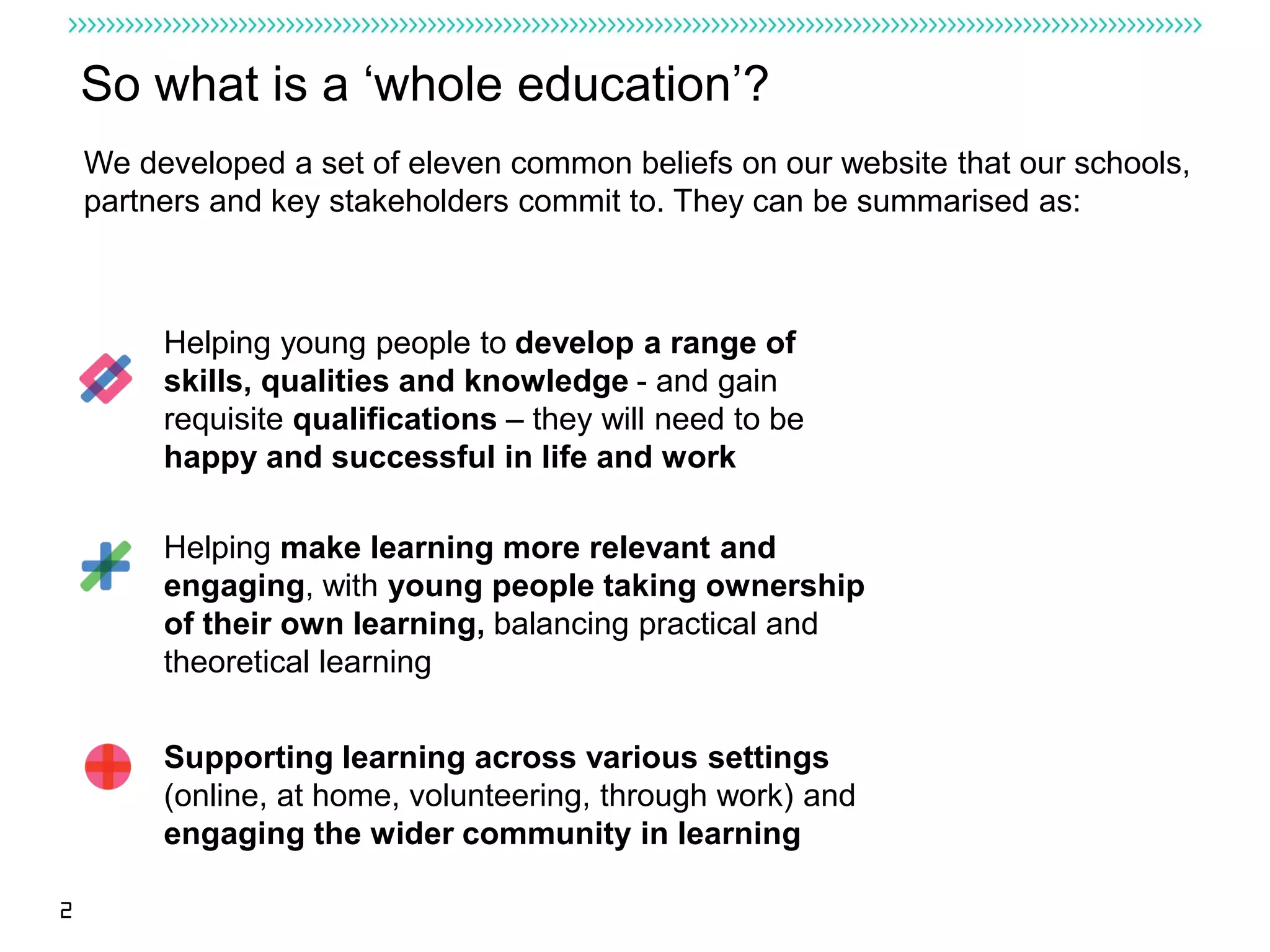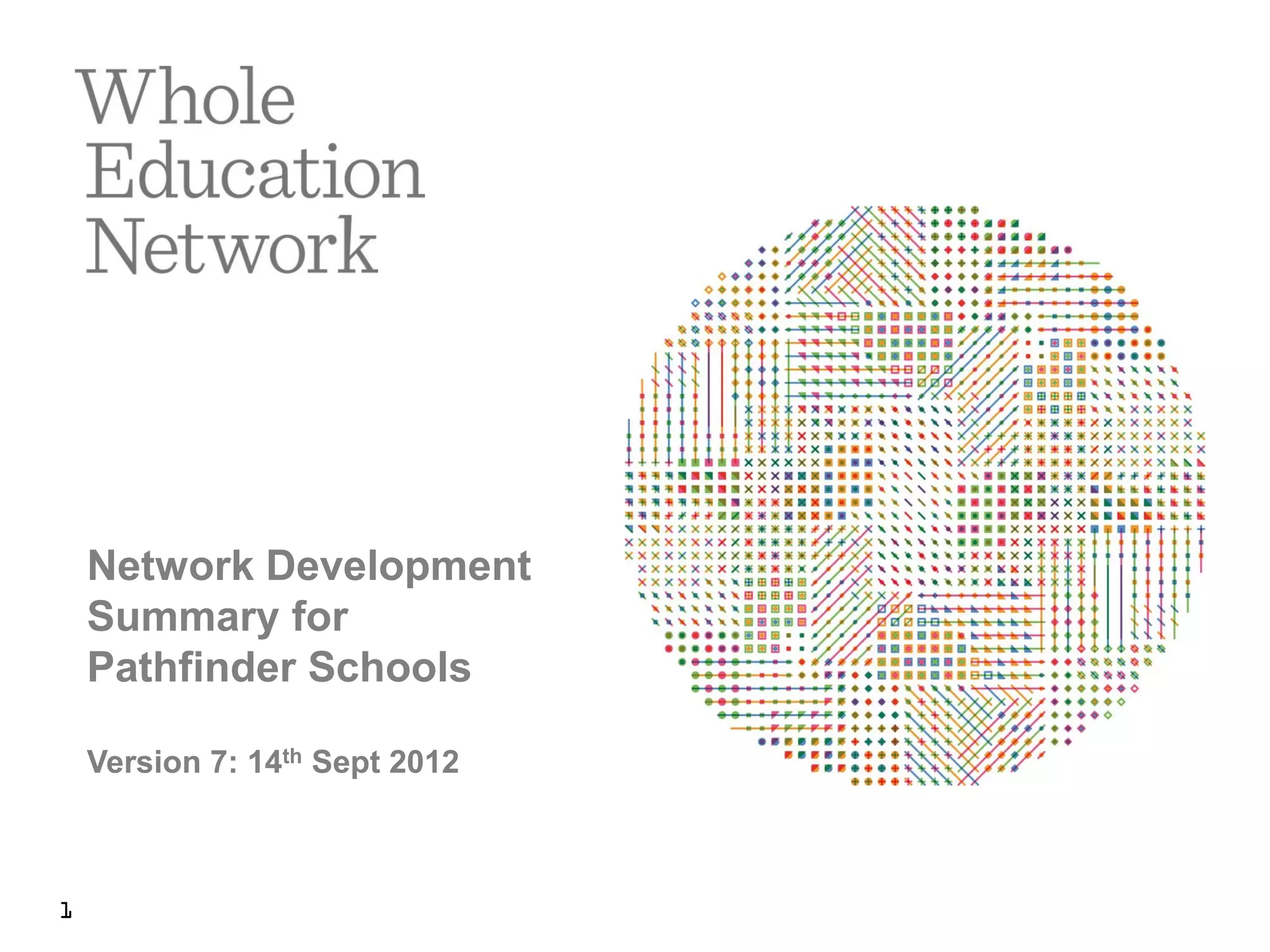 This document outlines the Whole Education Network, which aims to provide a "whole education" for all young people. It discusses (1) defining a whole education, (2) the mission to ensure all youth have access to it, and (3) guiding principles of being light touch, school-led, and iterative. Interest groups will focus on skills, qualities, leadership, and cross-cutting topics to support change over time as the network expands to include more pathfinder and network schools.