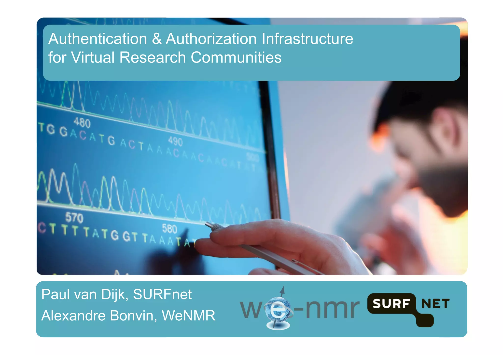 The document discusses the authentication and authorization infrastructure for virtual research communities, specifically focusing on the WENMR community and its use of the SURFconext ecosystem. It highlights the challenges of user verification and account management while emphasizing the importance of centralized and collaborative systems. It also notes that while progress has been made in authentication at national levels, further developments are needed in authorization infrastructure to enhance user experience and streamline inter-federation processes.