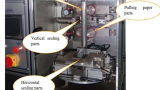 This machine automatically packs tea and other products into bags. It can produce 3000 bags per hour and pack materials like green tea, black tea, and herbal teas. The machine uses precision metering and filling, with options for electronic scales. It has a PLC touch screen control system and servo motors for accurate bag making. The main technical specifications include a capacity of 30-60 bags per minute and the ability to make triangular or flat bags between 50-90mm in size. Regular cleaning and maintenance is required to ensure safe and efficient operation.