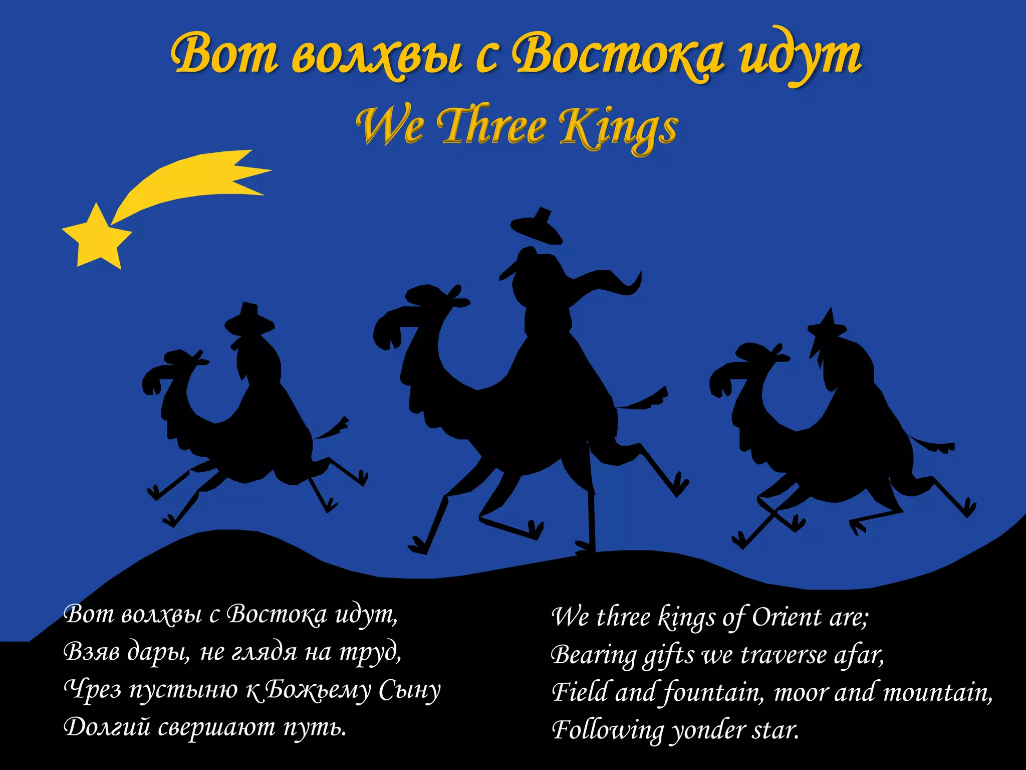 Документ представляет собой текст рождественской песни о волхвах, которые приносят дары младенцу Христу. Он описывает три дара: золото, ладан и смирну, и их символическое значение. Песня подчеркивает важность поклонения и признания Иисуса как царя и спасителя.