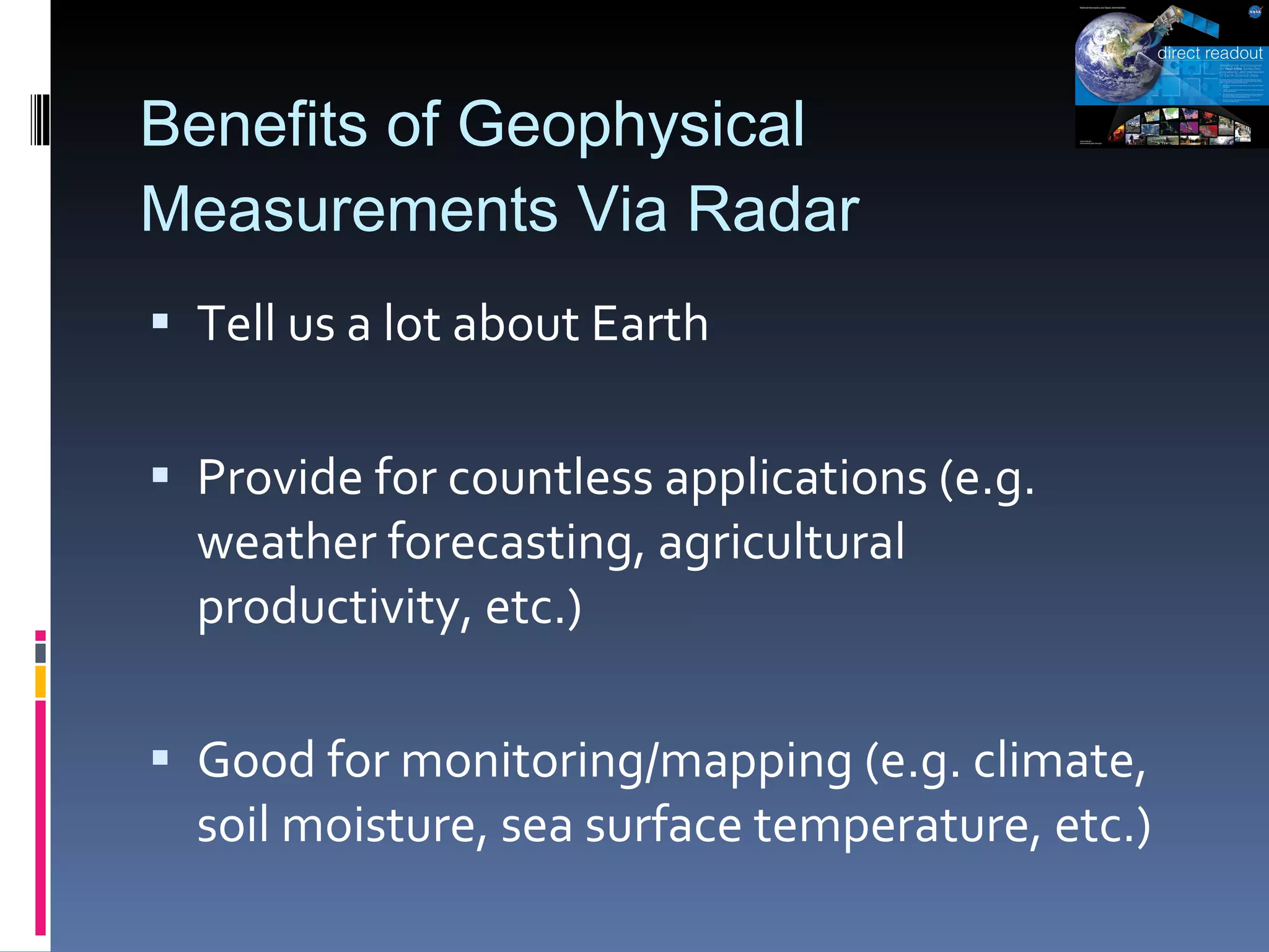 The document calls for increased use of active radar remote sensing to directly measure biomass from space. Direct measurements can monitor ecosystem health by assessing rehabilitation progress, restoration efforts, stability effects of human activity, and overall vegetation and organism health. In contrast, current passive methods are limited by only providing indirect inferences of biomass. Direct radar measurements are also beneficial as they can penetrate clouds and foliage to observe targets. The document suggests exploring frequencies that stimulate biological responses from vegetation to better understand ecosystem health from space.