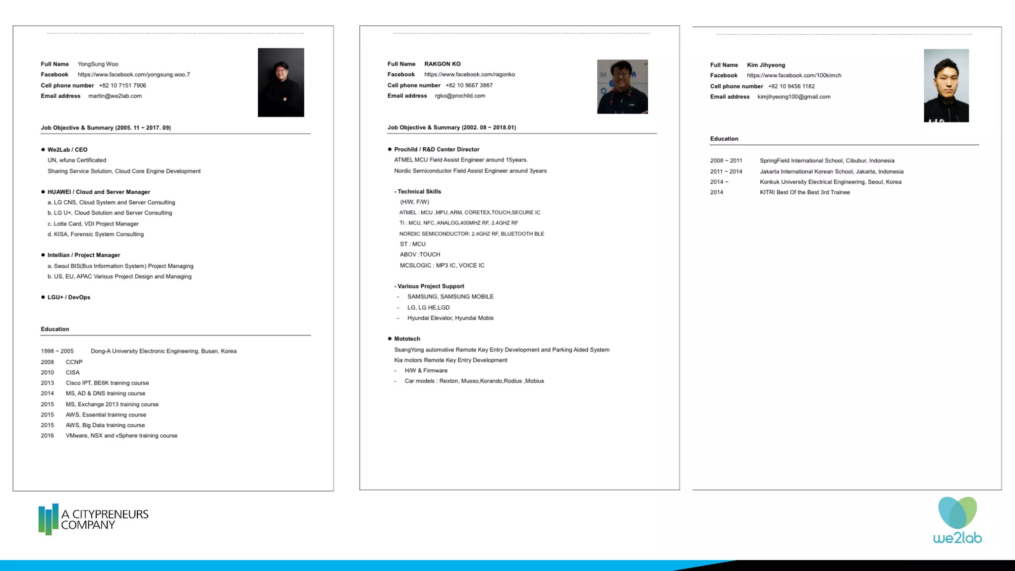 최우수팀 수상 성남산업진흥재단 ‘정글온, 특허 및 지식재산..’ 2017. 09 UN, WFUNA Certificate UN, ‘Urban Innovation Challenge : Citypreneurs’ 2016. 11 금상 수상 제주창조경제혁신센터 ‘2016년 스마트 관광..’ 2017. 05 ‘PROCHILD’ Partner IoT Device Factory Company 2016. 12 ‘DAZAYO’ Partner over 600 Hosts, Booking Platform Service 2017. 03 특허출원 ‘IoT 모듈을 포함하는 도어락 시스템...’ 10-2017-0053547 2016. 09 특허출원 ‘OTP 기능을 이용한 디지털도어락...’ 10-2016-0142078 2017. 08 정부지원사업 선정 창업진흥원 ‘재도전 성공패키지 2차’