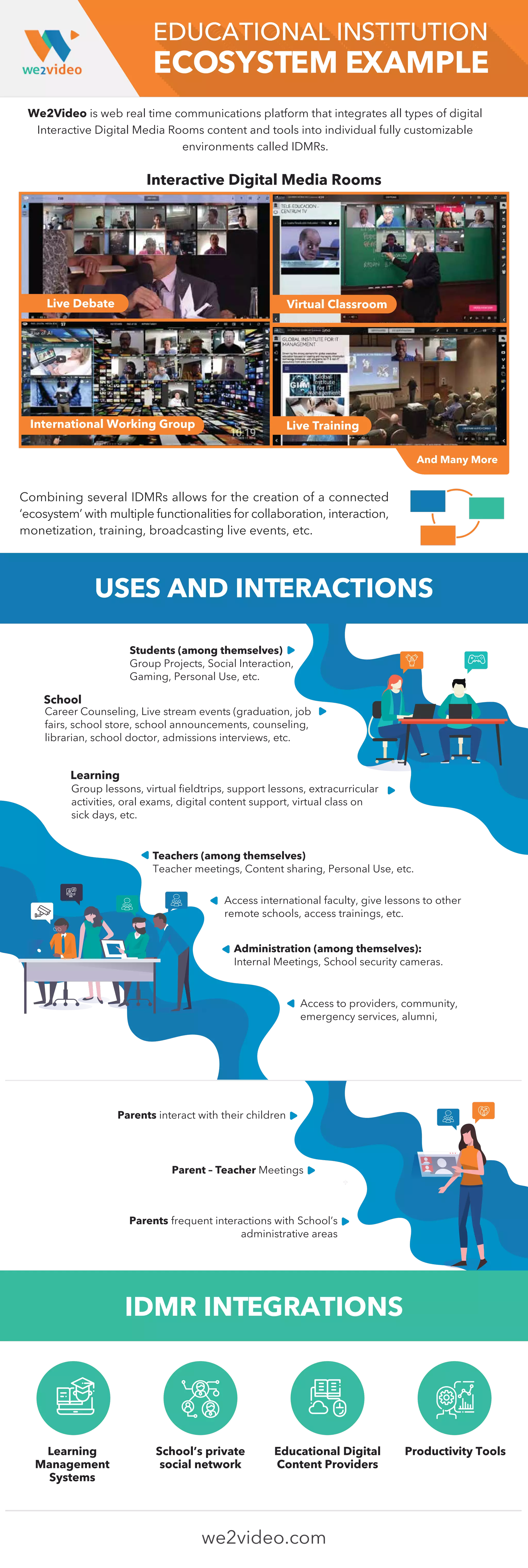 We2video is a web real-time communications platform that creates customizable interactive digital media rooms (IDMRs) for educational institutions, facilitating collaboration, training, and live events. The platform enables various users—teachers, students, and parents—to engage in interactive activities, share content, and access resources while fostering community and administrative interactions. By integrating multiple IDMRs, it forms an interconnected ecosystem that enhances learning experiences and supports various educational activities.