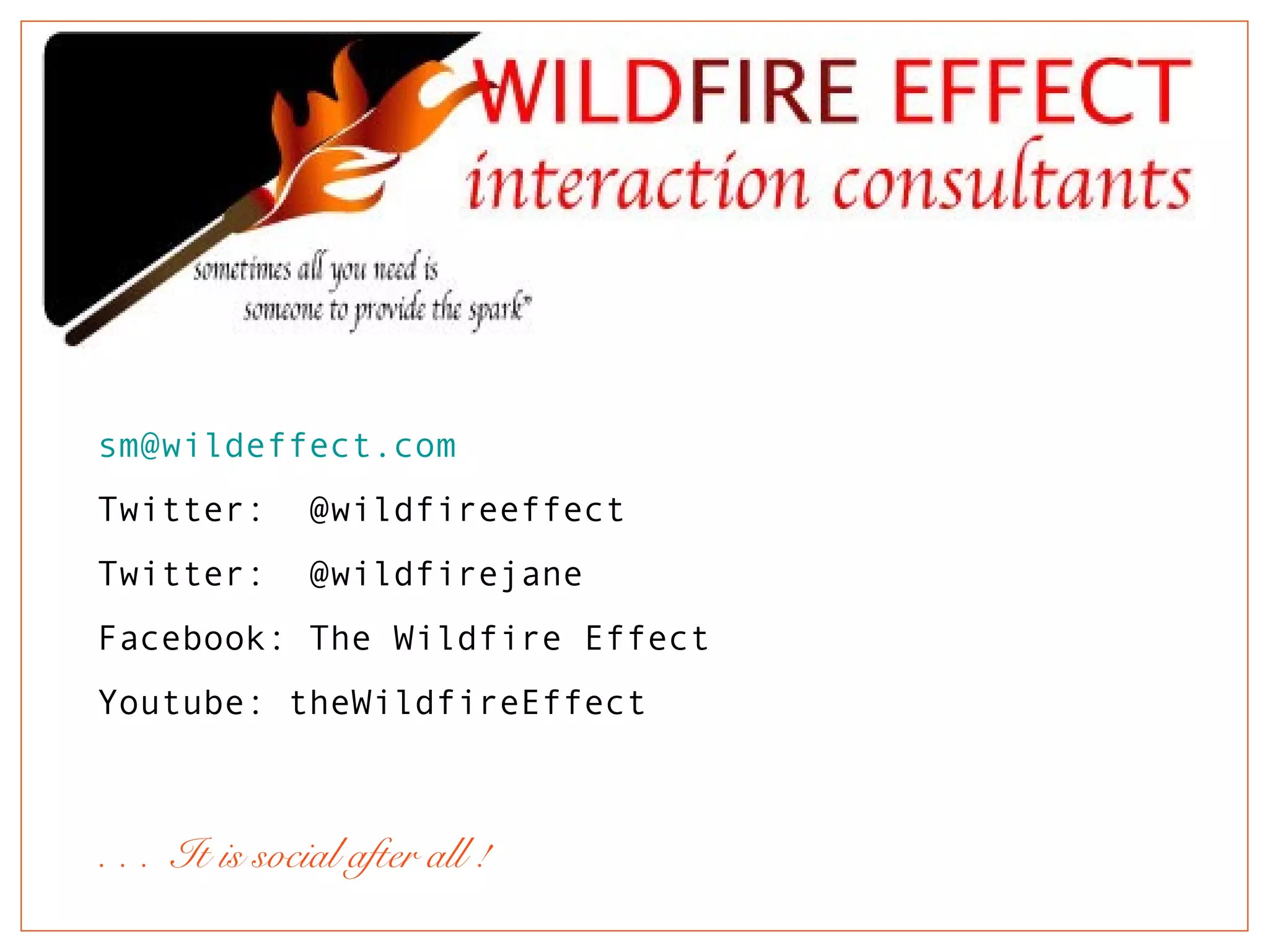 This document provides an overview of Wildfire Effect Consulting services to help demystify and create strategies for using social media. It recommends assessing resources, pinpointing goals, and creating a strategy. Wildfire Effect Consulting aims to simplify social media and make it a powerful force for clients by evaluating their needs and executing an effective plan.