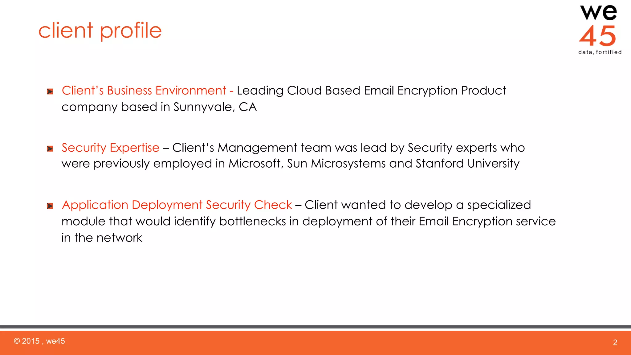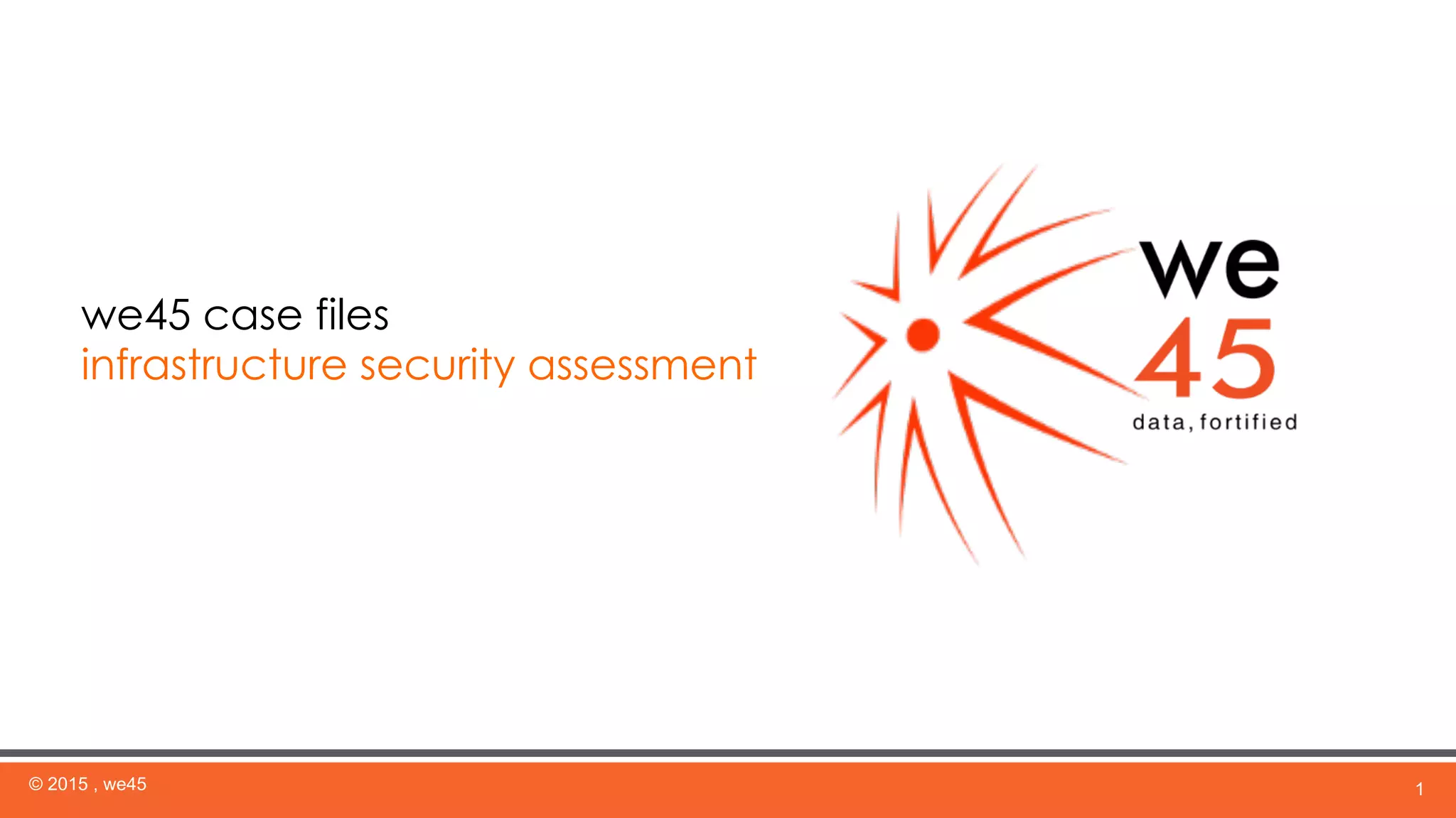 The document summarizes a security assessment conducted by we45 for a cloud-based email encryption company. we45 used their "Leanbeast" appliance to conduct reconnaissance, vulnerability scanning, and penetration testing of the client's AWS infrastructure. Several major vulnerabilities were found, including remote code execution on an ElasticSearch server and authentication flaws exposing customer data. we45 provided a detailed report of findings prioritized by risk level and recommended remediation strategies to improve the client's security posture.