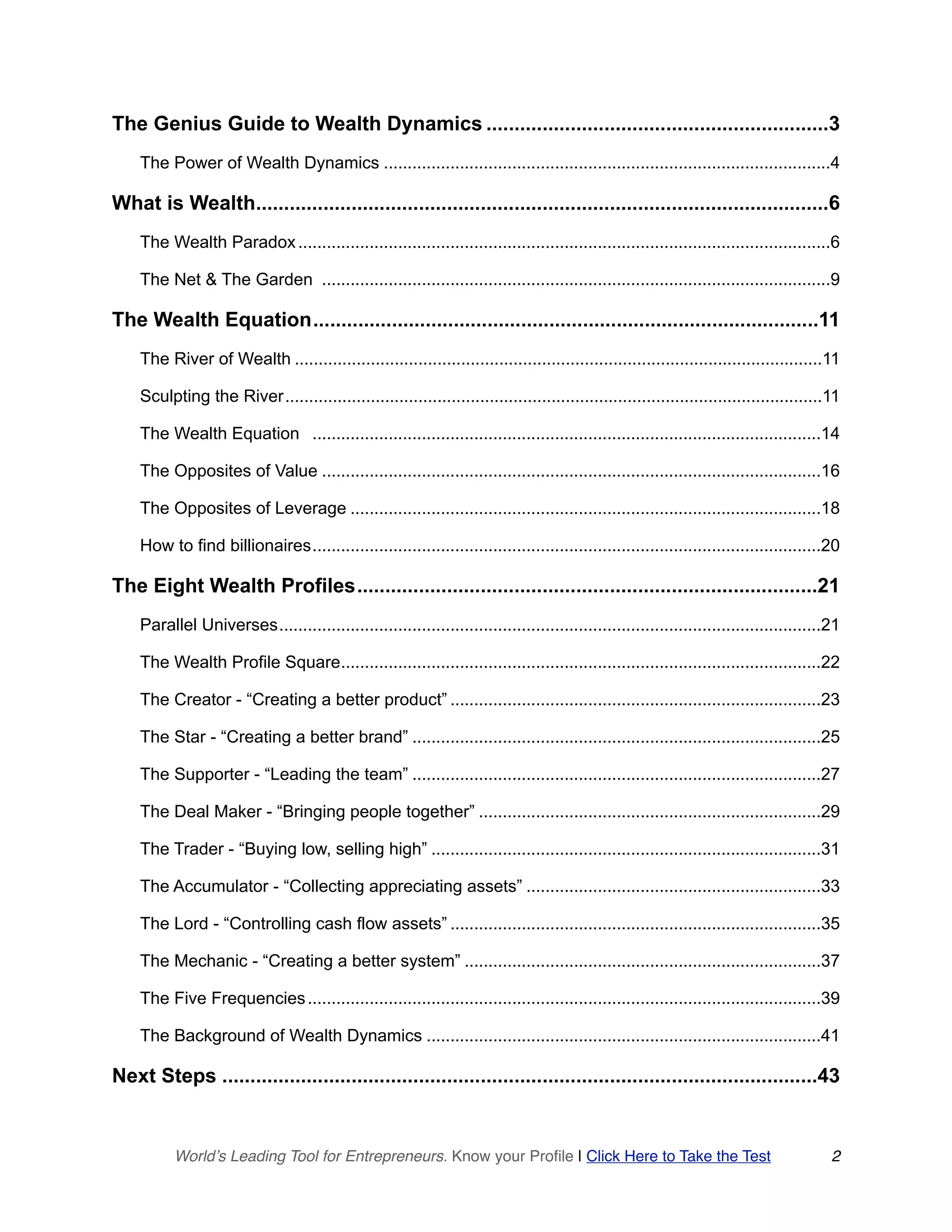 This document provides an introduction to the Wealth Dynamics profiling system for entrepreneurs. It discusses key concepts in wealth dynamics, including defining wealth as what is left after losing all your money. It introduces the idea of building wealth through cultivating your "garden" or unique value, rather than chasing opportunities like catching butterflies in a net. The document outlines 8 wealth profiles that entrepreneurs can use to understand their natural talents and strengths for creating wealth. It encourages taking the Wealth Dynamics test to learn one's unique profile.