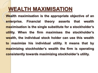 Wealth maximization is the appropriate objective of a firm according to financial theory. When a firm maximizes shareholder wealth, individual shareholders can then use that wealth to maximize their own utility. A shareholder's current wealth equals the number of shares owned multiplied by the current stock price per share. Therefore, firms should aim to maximize their current stock price in order to increase shareholder wealth and value. However, stock price maximization should be pursued over the long run to reflect the normal market value, not just short-term fluctuations. Financial decisions should increase the current present value through cost-benefit analysis.