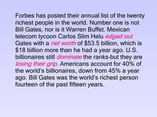 Carlos Slim Helu, a Mexican telecom tycoon, has surpassed Bill Gates as the richest person in the world according to Forbes' annual list of the twenty richest people. Slim Helu's net worth increased to $53.5 billion, $18 billion more than the previous year. While Americans still make up 40% of the world's billionaires, this is down from 45% in the previous year, showing that they are gradually losing their dominance at the top of the list. Bill Gates had held the top spot for fourteen of the past fifteen years.