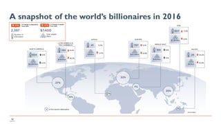 The document provides insights into global billionaires in 2016 based on data from the Wealth-X Billionaire Census 2017. It finds that over half of billionaires had a net worth of less than $2 billion, with 95% between $1-10 billion. Japan saw the largest increase in billionaires at 27%. New York remained the top city for billionaires. Technology and textiles accounted for a higher proportion of new billionaires, while finance/banking was the top industry for existing billionaires. On average, tech billionaires were younger, more likely to be self-made, and gave more to philanthropy than other billionaires. The presentation profiles characteristics of tech billionaires as independent thinkers focused on future