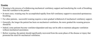 This document provides information about weaning patients from mechanical ventilation. It discusses the weaning process, criteria for determining readiness for weaning, procedures for gradual withdrawal of ventilator support, signs of successful or failed weaning, and causes of weaning failure. Weaning involves transitioning the work of breathing from the ventilator back to the patient. Readiness is determined based on clinical, ventilatory, oxygenation, and pulmonary criteria. Weaning methods include spontaneous breathing trials, pressure support ventilation, and synchronized intermittent mandatory ventilation. Close monitoring is needed to identify signs of weaning failure.